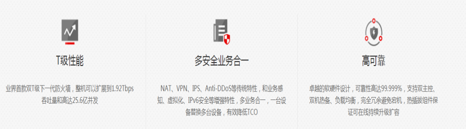 | 應用安全特性 | 支持超過5000種漏洞特征的攻擊檢測和防御。支持Web攻擊識別和防護,如跨站腳本攻擊、SQL注入攻擊等; 高性能病毒引擎,可防護500萬種以上的病毒和木馬,病毒特征庫每日更新; 采用基于云的URL分類過濾,預定義的分類庫超過80個大類,8500多萬 | ||